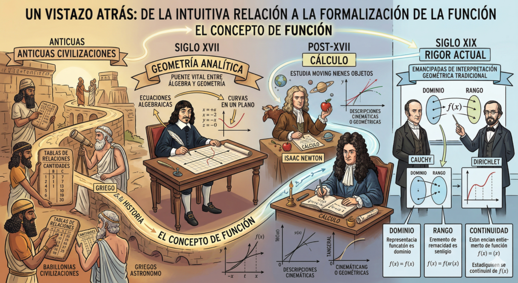 Posteriormente, figuras monumentales como Isaac Newton y Gottfried Wilhelm Leibniz desarrollaron el cálculo, pero sus ideas sobre las funciones se basaban más en descripciones cinemáticas o geométricas. El rigor actual en conceptos como: dominio, rango y continuidad, se debe a los trabajos de Cauchy y Dirichlet en el siglo XIX, quienes lograron emancipar estas nociones de su interpretación geométrica tradicional.