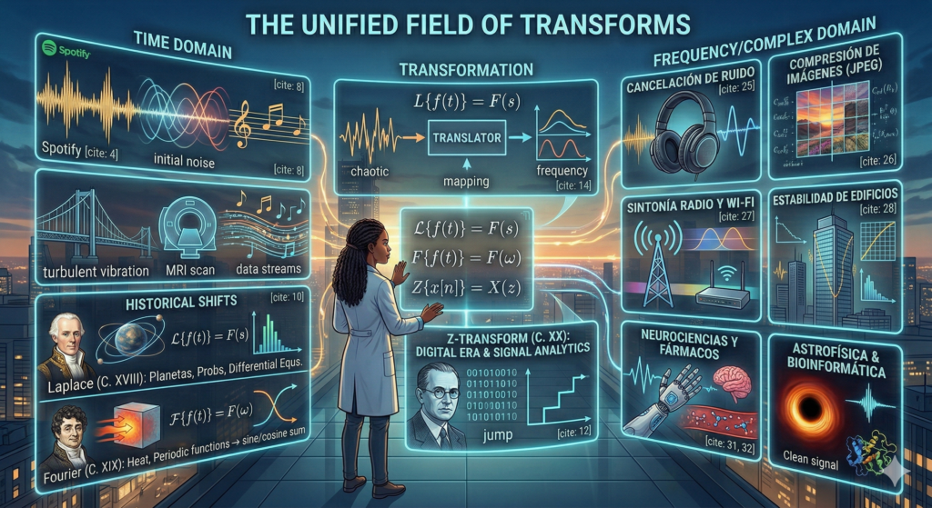 Vivimos en un océano de señales. Cada vez que escuchas una canción en Spotify, recibes una notificación en tu teléfono; asimismo, cuando te realizas una resonancia magnética, estás interactuando con una sinfonía de datos que el ojo humano no puede descifrar a simple vista. Para un físico o un ingeniero, la realidad no es solo lo que vemos en el tiempo cronológico; es una estructura oculta que requiere un “traductor” para volverse manejable. Ese traductor es la Transformada Integral. En la enseñanza de la ingeniería, estas herramientas no son meros ejercicios de cálculo, sino la llave que permite convertir el caos de las variaciones continuas en la simplicidad de las operaciones algebraicas.