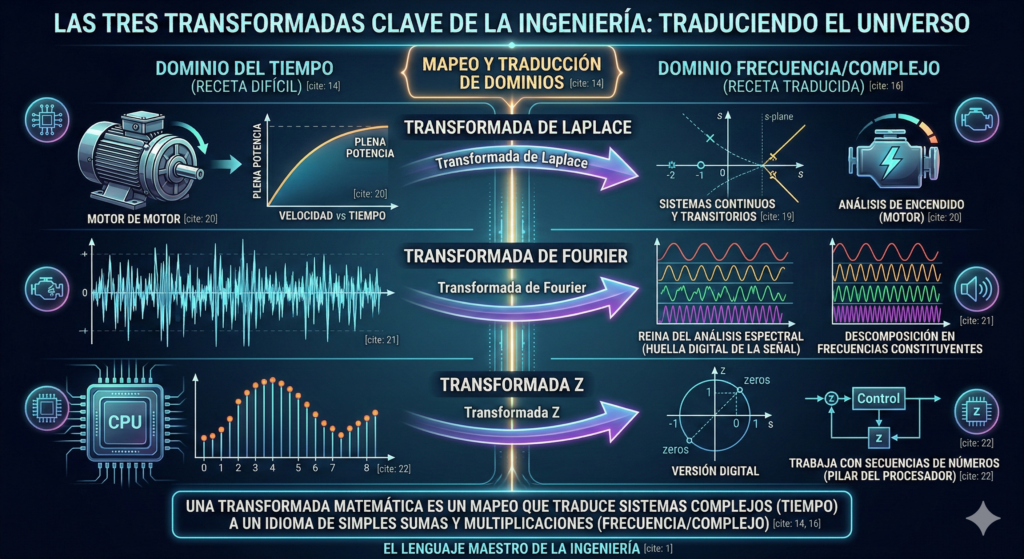 En términos sencillos, una transformada matemática es un mapeo. Imagina que tienes una receta escrita en un idioma extremadamente difícil (en el dominio del tiempo). Cocinar con ella requiere un esfuerzo mental agotador porque cada instrucción depende de la anterior (ecuaciones diferenciales).