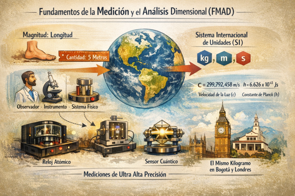 La evolución del conocimiento humano nos ha llevado a abandonar las referencias locales y arbitrarias (p.ej.: el pie de un rey, un tabaco de distancia, etc.) para abrazar el Sistema Internacional de Unidades (SI). En la actualidad, este sistema es más elegante que nunca: desde 2019, todas las unidades basicas se definen fijando valores numéricos de constantes físicas fundamentales, como la velocidad de la luz (C) o la constante de Planck (h). Esta estabilidad permite que la ciencia sea reproducible en cualquier rincón del planeta. De este modo se garantiza que un kilogramo de masa sea lo mismo en Bogotá que en Londres. Recientes investigaciones destacan que esta transición hacia un SI cuántico es crucial para la próxima generación de sensores de ultra alta precisión.